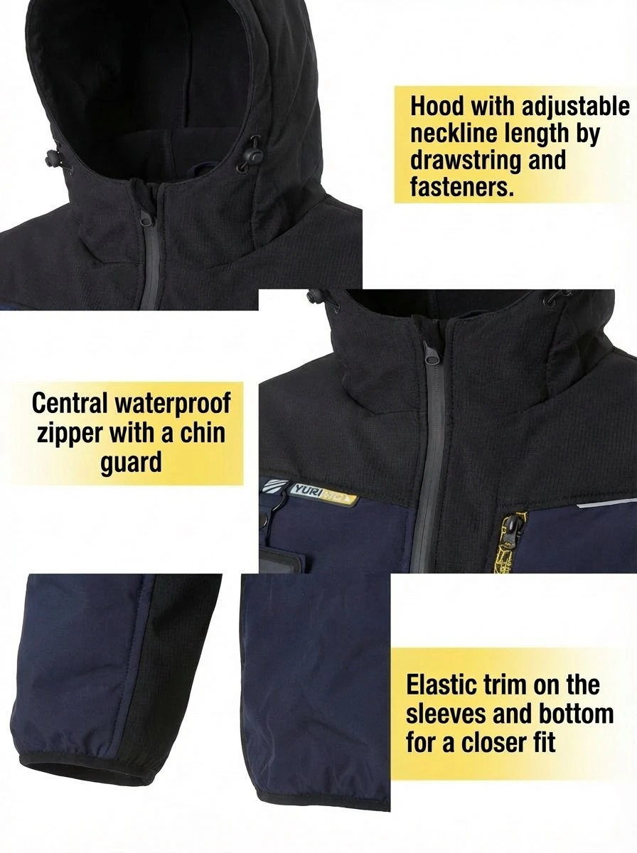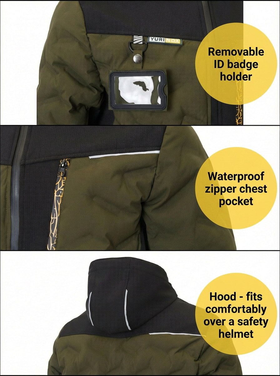 Adjustable helmet-compatible hood, Waterproof zippers, Removable ID badge holder, Multi-Pocket Design, Elastic cuffs and hem
