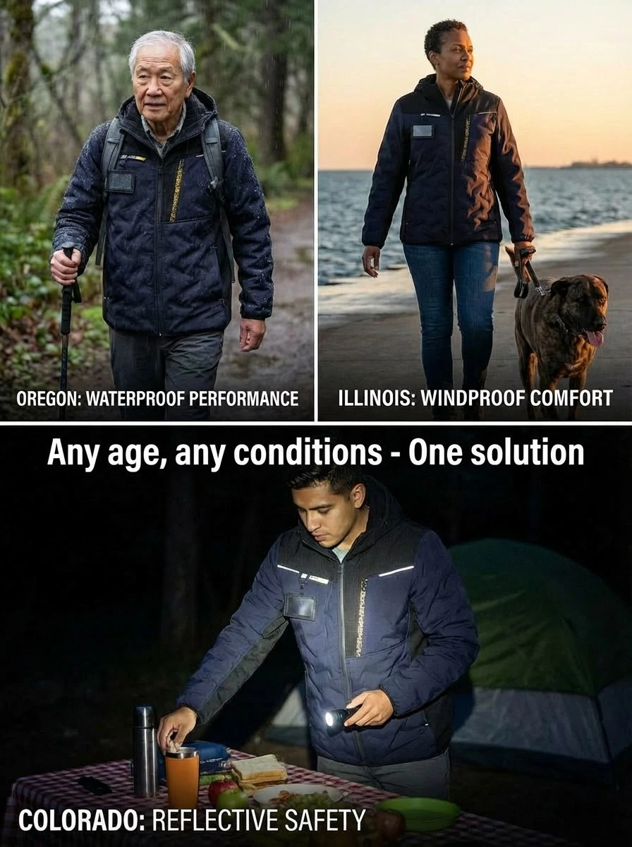 Waterproof (8000 mm H₂O), Windproof, Insulated, Thermal-Bonded Construction, Reflective Elements