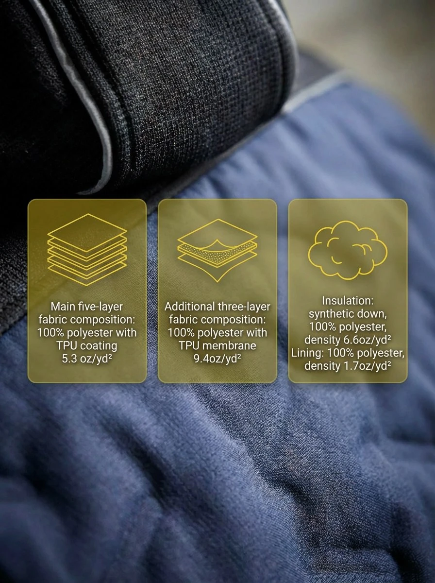 Main — 100% Polyester with TPU coating (8000 mm H₂O), 5.3 oz/yd²; Reinforced 3-layer fabric — 100% Polyester with TPU coating (8000 mm H₂O), 9.4 oz/yd²; Insulation — 100% Polyester (Synthetic Down), 6.6 oz/yd²